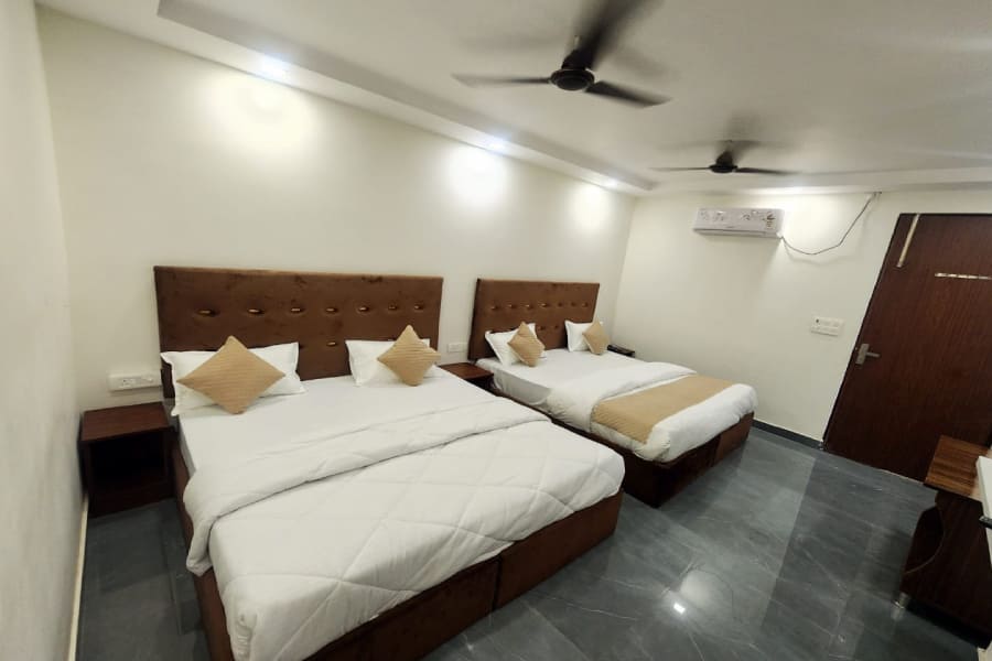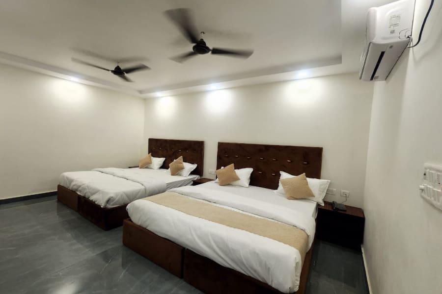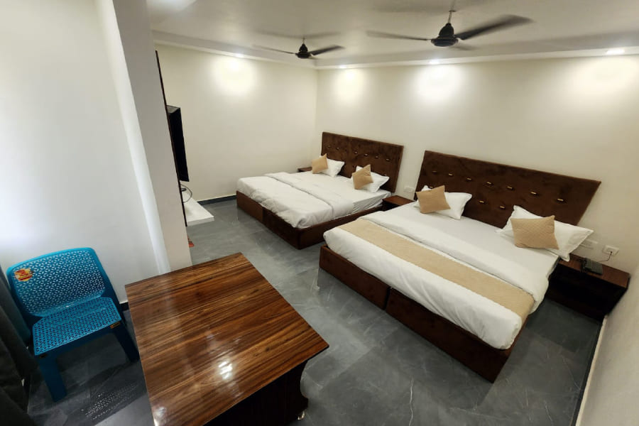The Four Bed Forest View Room is a spacious retreat designed especially for families and small groups looking to experience Haridwar’s natural beauty without compromising on comfort. Set against the backdrop of lush greenery, this room offers stunning views of the nearby forested hills, providing a peaceful contrast to the spiritual energy of the city. Whether you're waking up to the chirping of birds or relaxing after a temple visit, the natural scenery right outside your window adds a refreshing touch to your stay. The room features four comfortable beds with high-quality mattresses and crisp linens, ensuring everyone in your group enjoys a restful sleep.