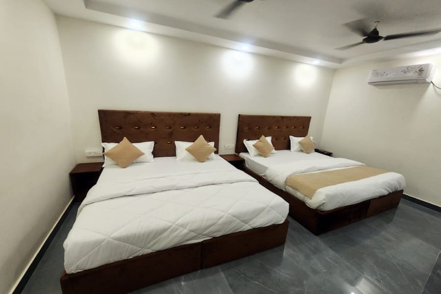 The Four Bed Forest View Room is a spacious retreat designed especially for families and small groups looking to experience Haridwar’s natural beauty without compromising on comfort. Set against the backdrop of lush greenery, this room offers stunning views of the nearby forested hills, providing a peaceful contrast to the spiritual energy of the city. Whether you're waking up to the chirping of birds or relaxing after a temple visit, the natural scenery right outside your window adds a refreshing touch to your stay. The room features four comfortable beds with high-quality mattresses and crisp linens, ensuring everyone in your group enjoys a restful sleep.